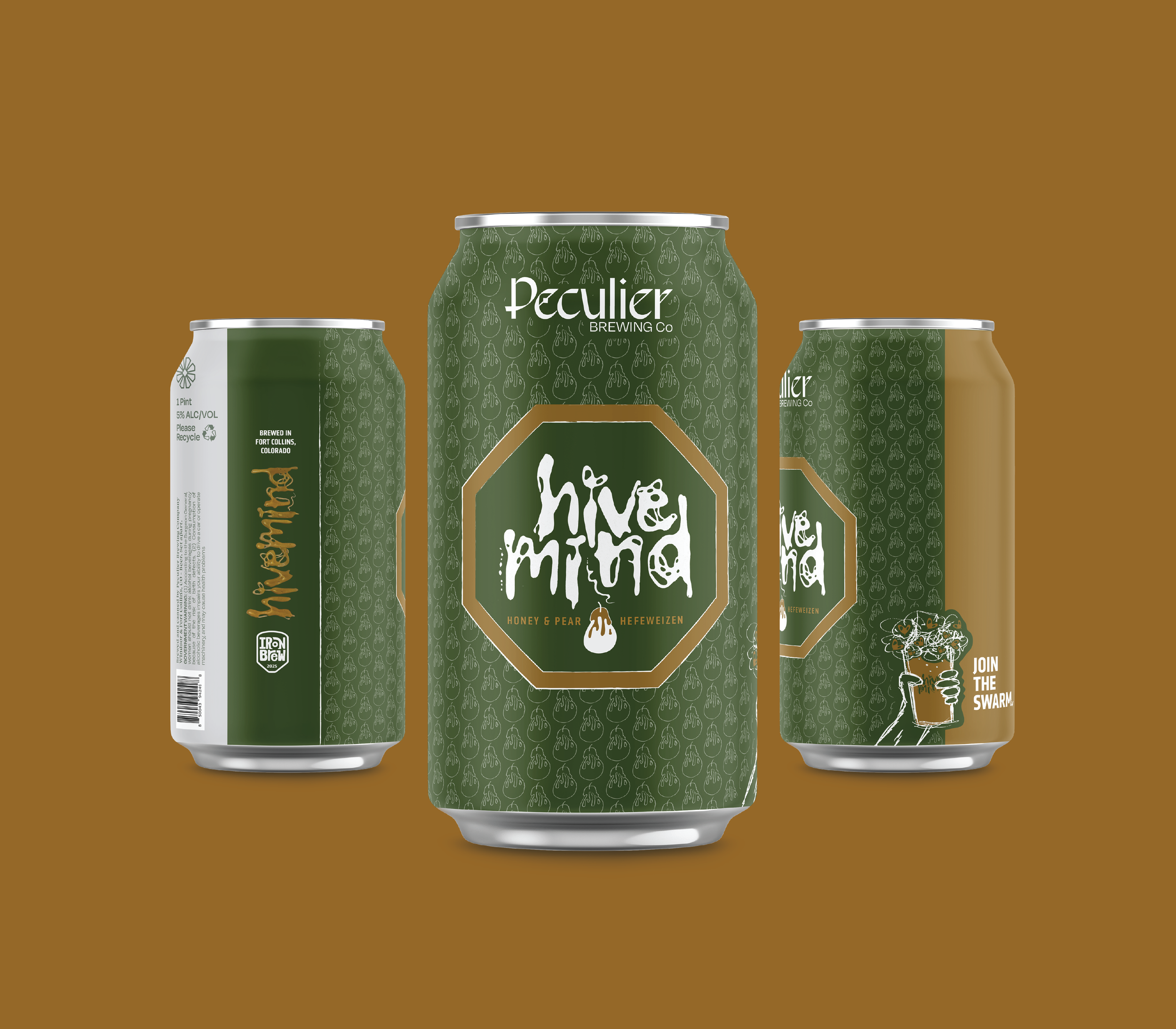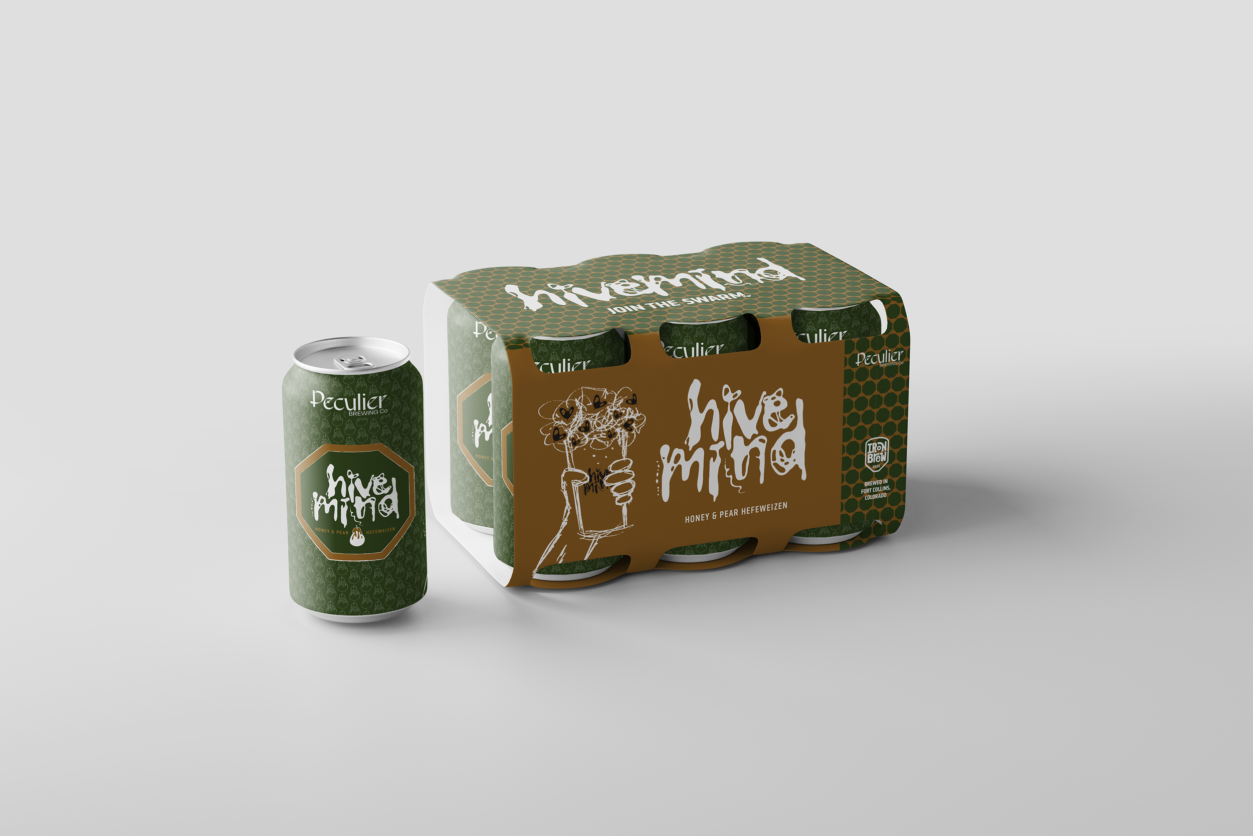 Hivemind is a honey pear hefeweisen beer brewed by CSU fermentation science students and Peculier Brewing Co as part of the IronBrew competition. Based on local ingredients, the Hivemind brand brings together experimental typography and packaging design expanded across brand systems.